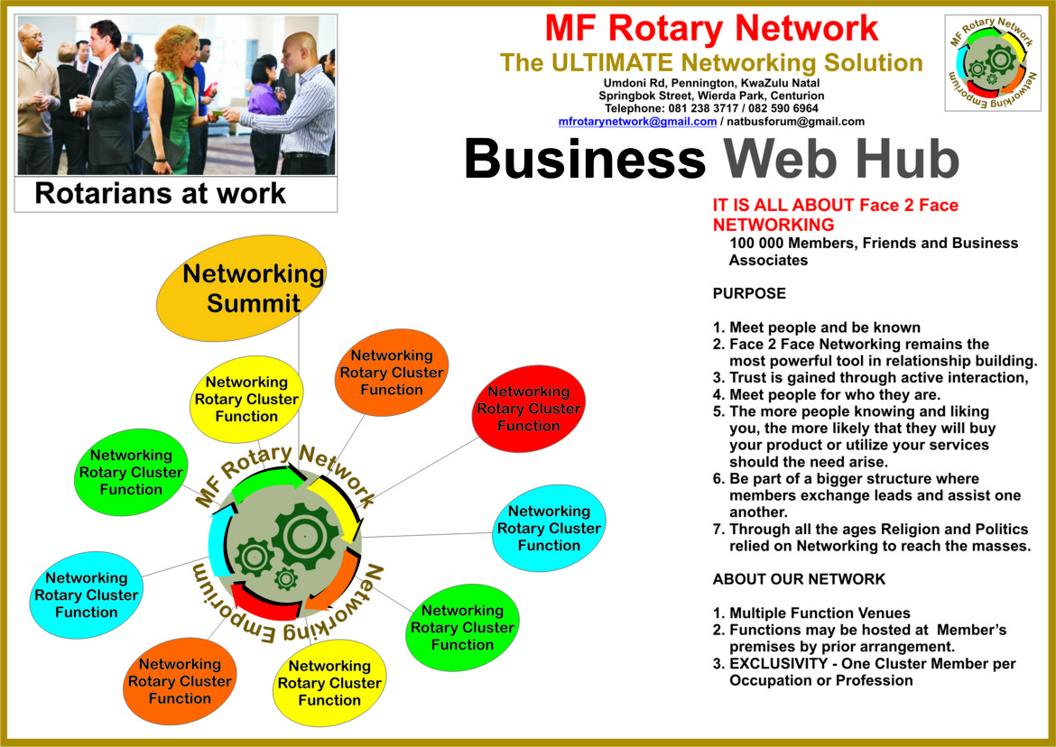 A network is merely a Communications Platform. MF Rotary Network has been established as a Networking Platform for like-minded business people. We promote Networking Functions and still believe in the value of Physical Face 2 Face Networking, but also incorporating Online Networking Functionality. We focus on Business 2 Business and Business 2 Client Networking.